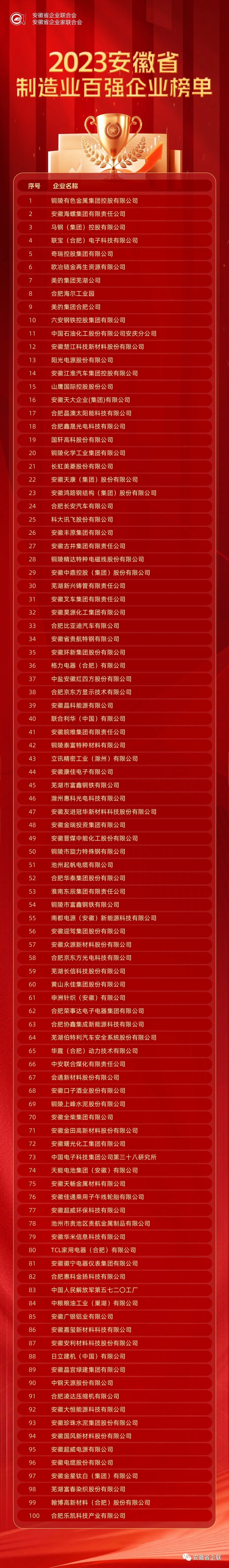 為全面貫徹習近平新時代中國特色社會主義思想和黨的二十大精神,著力推動我省企業高質量發展,促進企業做強做優做大,并為社會各界提供安徽大企業發展的數據信息,今年,我會連續第十九次在全省開展了安徽企業100強申報排序活動。根據企業自愿申報,有關機構確認,以2022年企業營業收入為標準,經審定,確定了安徽企業綜合100強和制造業、服務業企業100強。現將名單予以公布(詳見附件)。2022年,面對風高浪急的國際環境和艱巨繁重的發展穩定任務,安徽大企業迎難而上,全面落實疫情要防住、經濟要穩住、發展要安全的要求,實現了企業運行平穩、質量穩步提升、社會貢獻度持續增長,取得了來之不易的新成就。安徽百強企業入圍門檻繼續提升,經營規模快速增長,國際化經營成效顯著,資產總額首次突破4萬億元,進一步鞏固了大企業在市場競爭中的領先地位。希望安徽百強企業認真貫徹落實黨的二十大精神,立足中國式現代化全局謀劃自身發展,積極投身我省“三地一區”和“七個強省”建設,堅持高質量發展方向,著力提升核心競爭力,為建設現代化美好安徽做出更大的貢獻。